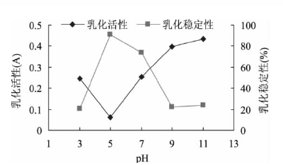 顧楠[9]等人研究鷹嘴豆分離蛋白乳化性時,采用不同pH值梯度對其進行測定。pH值范圍選定為3、5、7、9、11,分別測量在不同pH處理過后的蛋白的乳化活性和乳化穩定性。結果如下:
