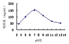 2.3.1.3 吸附pH的考察 將一定量的那他霉素浸提液分別調節成不同pH,然后使用HZ816樹脂吸附,考察pH對HZ816樹脂吸附量的影響,結果見圖4。